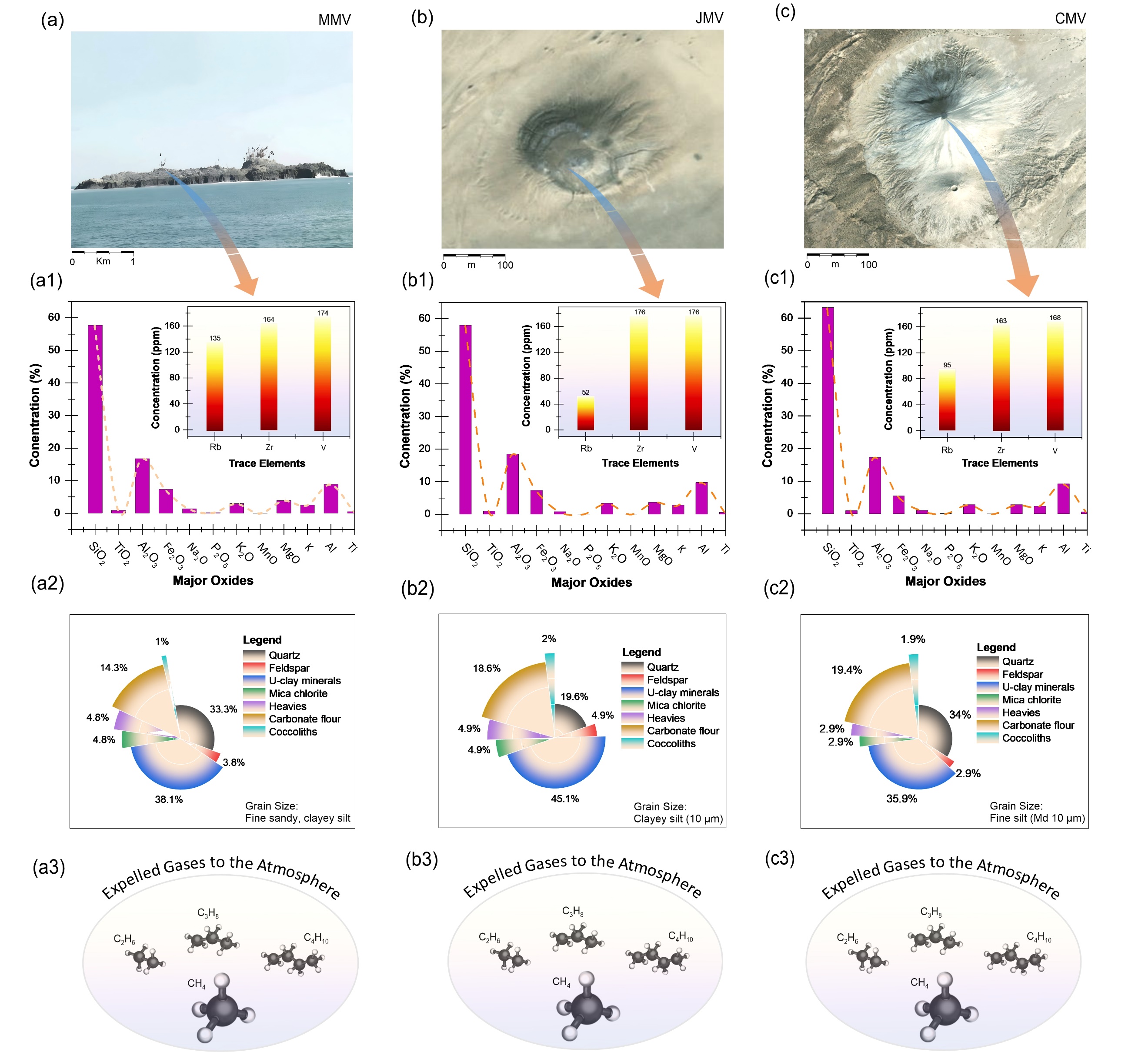 俯沖帶是巖石圈揮發物流通的關鍵界面,復雜的構造和地球化學相互作用促進了地殼深部儲層中氣體和流體的釋放。泥火山活動作為這些過程的動態表現,貢獻了CH?排放,影響了全球CH?預算并對海洋生態系統產生影響。全球范圍內,約2000處泥火山位于俯沖帶,突顯了俯沖相關的地球化學和構造過程在促進CH?向大氣和水圈排放中的重要性。 近年來,遙感技術(合成孔徑雷達干涉測量、航空攝影、機載激光掃描)與水聲學方法的協同應用,系統刻畫了陸域與海域富CH?泥火山的三維幾何形態與空間分布特征。氣相色譜、同位素分析、原位氣體通量測量以及噴出的泥火山氣體與流化泥漿的地球化學分析進一步推進了對分子組成、同位素特征和再循環組分化學性質的研究。此外,深海鉆探和搭載CH?傳感器的潛水器為噴發活動、揮發性排放及潛在危害提供了新的見解。