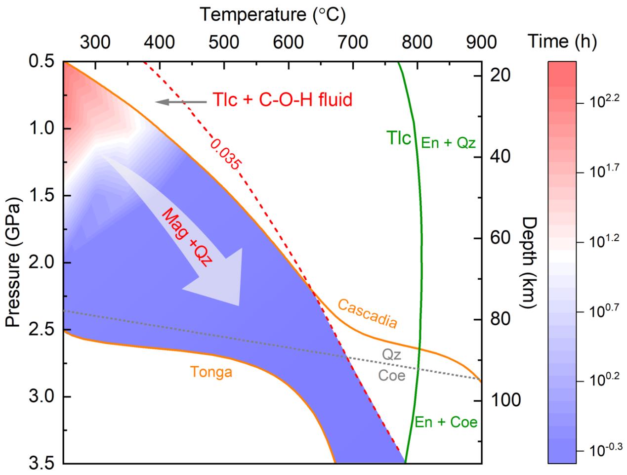 本研究采用金剛石壓腔(DAC)結合原位拉曼光譜技術,系統研究了俯沖帶溫度壓力條件下滑石與C-O-H流體的碳酸化反應過程。研究結果發(fā)現滑石在溫度> 250°C、壓力>1 GPa時,可快速轉化為菱鎂礦與石英,有效地將流體中的CO2封存到新形成的熱力學更穩(wěn)定的菱鎂礦中,從而被挾帶進入地球深部(見附圖)。此外,滑石碳酸化后還可能通過改變俯沖帶礦物組成,影響到包括地震活動性在內的動力學過程。本研究的結果構建了滑石碳酸化反應的熱力學相圖,為更好地理解地球深部碳循環(huán)過程和受相變影響所致的地球動力學行為提供了必要的實驗約束。