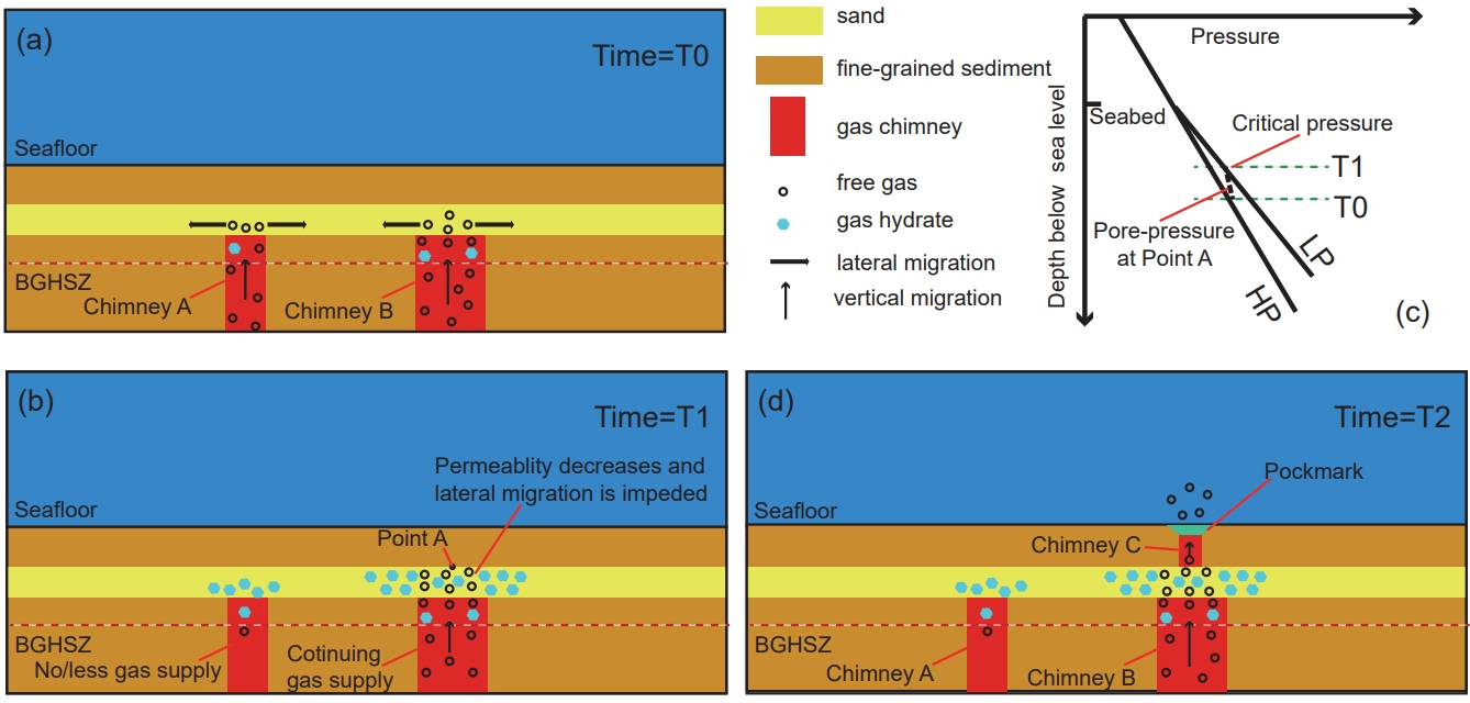 該研究還表明上覆泥層中二次水力壓裂的發(fā)生,須具備特定的超壓與氣體供給條件(圖3)。當(dāng)較低的甲烷通量在進入砂層后迅速形成天然氣水合物,導(dǎo)致孔隙堵塞、滲透率降低,從而引發(fā)自封閉效應(yīng)。該過程抑制了氣體向上部的輸運,致使砂層頂界孔隙壓力無法有效累積至破裂壓力臨界值。這一機制很好地解釋了實際地質(zhì)現(xiàn)象:盡管部分砂層下伏氣煙囪結(jié)構(gòu)發(fā)育,但其對應(yīng)上覆地層中并未形成貫穿至海底的氣體逸出路徑。原因在于低通量條件下氣體運移路徑被天然氣水合物阻斷,超壓體系未能充分發(fā)育,達不到泥巖破裂所需的最小壓力條件。